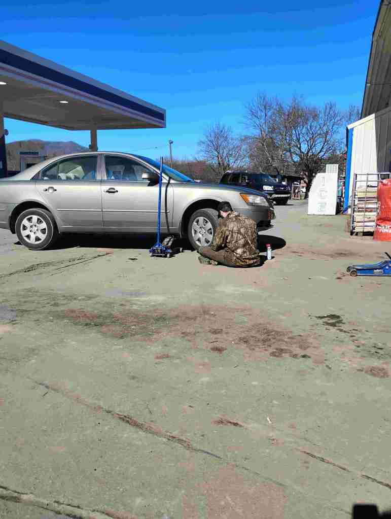 I drove down the hill to the service station, and two men went right to work. One moved the car a few inches while the other looked for a nail or screw. They jacked up the car, pulled out the screw, put a plug in it, let the car down, and it was done!