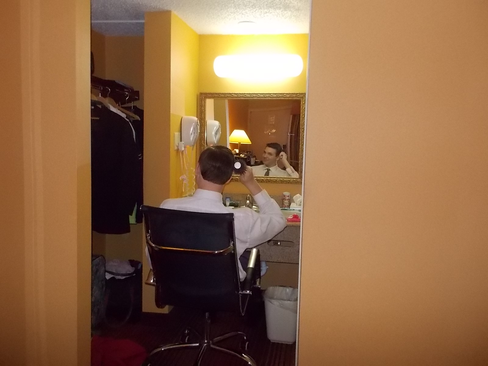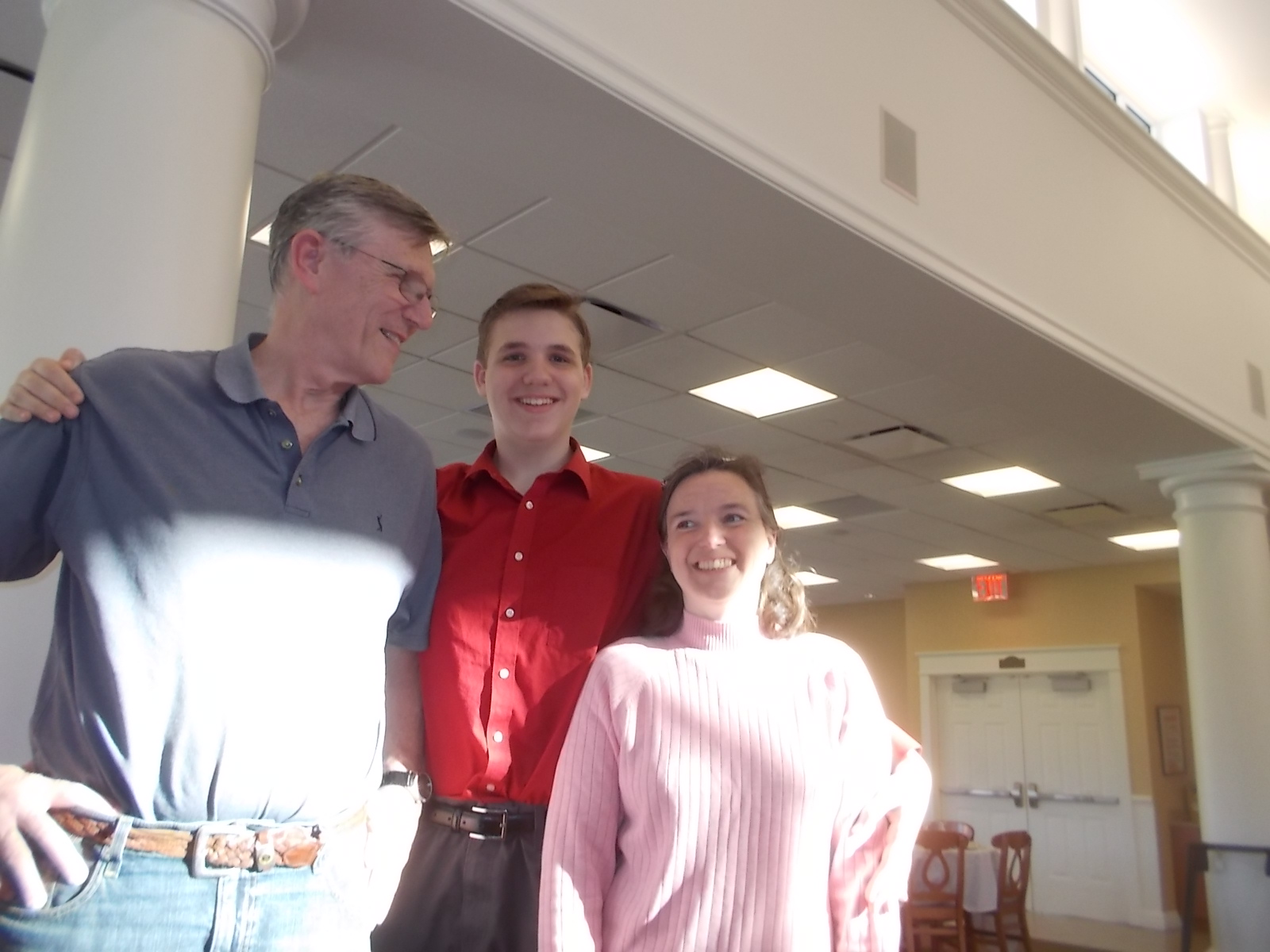 First, Nate found a new way to use the midget mirror in the motel. He sat in a chair to comb his hair. We went to Sunday School and to the long confirmation service. It was good to see our friends there, though there wasn’t much time to talk. We were invited to the lunch for one of the confirmands, Dan. We had some appetizers, and just before the burgers were coming off the grill, we had to leave. I rode with Kate, and Nate went with John. We arrived at David’s college about 10 minutes before the concert began. Whew! That was close!