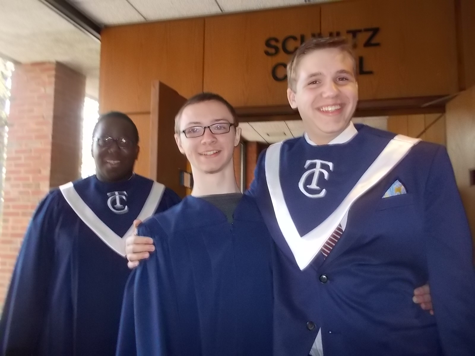 ram, we met David’s tour roommate and his mother. The oddest thing was that Nate was almost a soulmate for the roommate. Both wear suits to school, carry attache cases, and have the same last name! We’ll see David and Davin in a week and a half when the choir sings in one of the churches we attend in Asheville. I took a picture of Nate wearing David’s stole while they were horsing around after the concert. We ate dinner at the diner where we used to take Lise and Kate when they were at Concordia. We split then, Kate going to New Jersey, David back to campus, and we to Long Island. It had been quite a day.