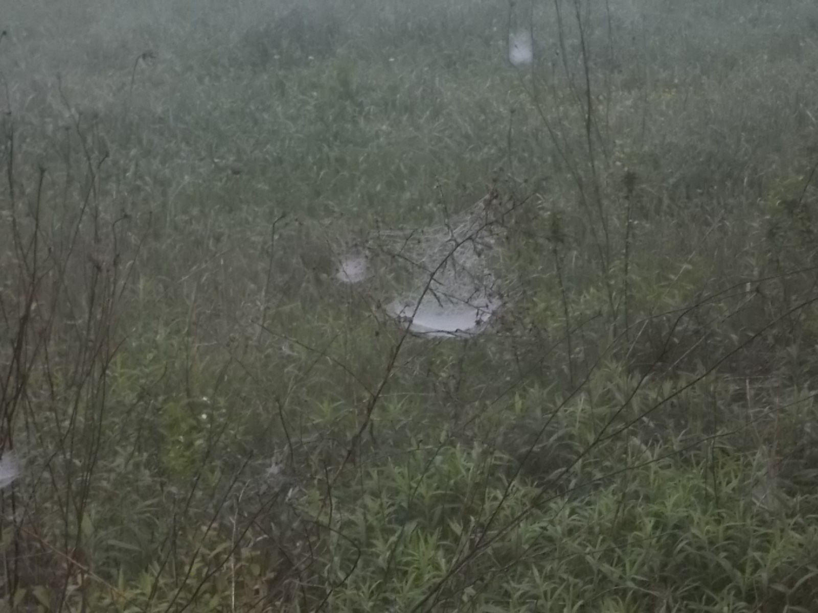 I’ve been aware of saucer-shaped spider webs since we first moved here. In October the webs looked like a special Halloween decoration on the evergreens at the top of our street. Today the webs in the sheep pasture looked as if they had ghostly roofs on top. Down in the valley, the webs were closer to the road. Thankfully I’ve never seen a single spider, so I can view the webs as art. A double set of webs on the same weed suggested a two-story living arrangement. Next door was a mother/daughter abode. Most days the webs are invisible, but they were highly visible today with the morning mist clinging to every thread.