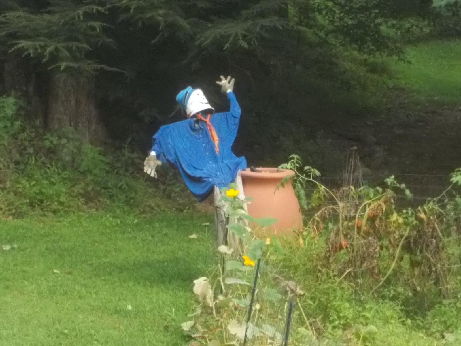 When I saw the scarecrow in the neighbor’s garden this morning, I had to bring a photo home. The scarified gent was wearing a tie and a hat! He may not be more effective than lesser dressed crows, but he had a very jaunty attitude.