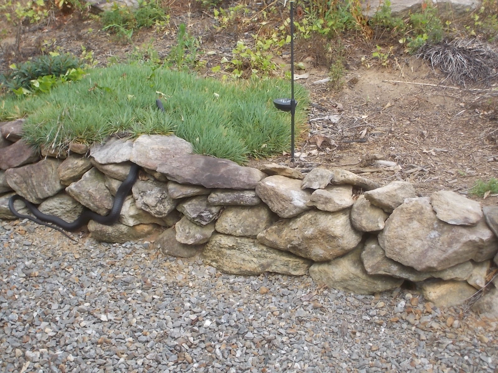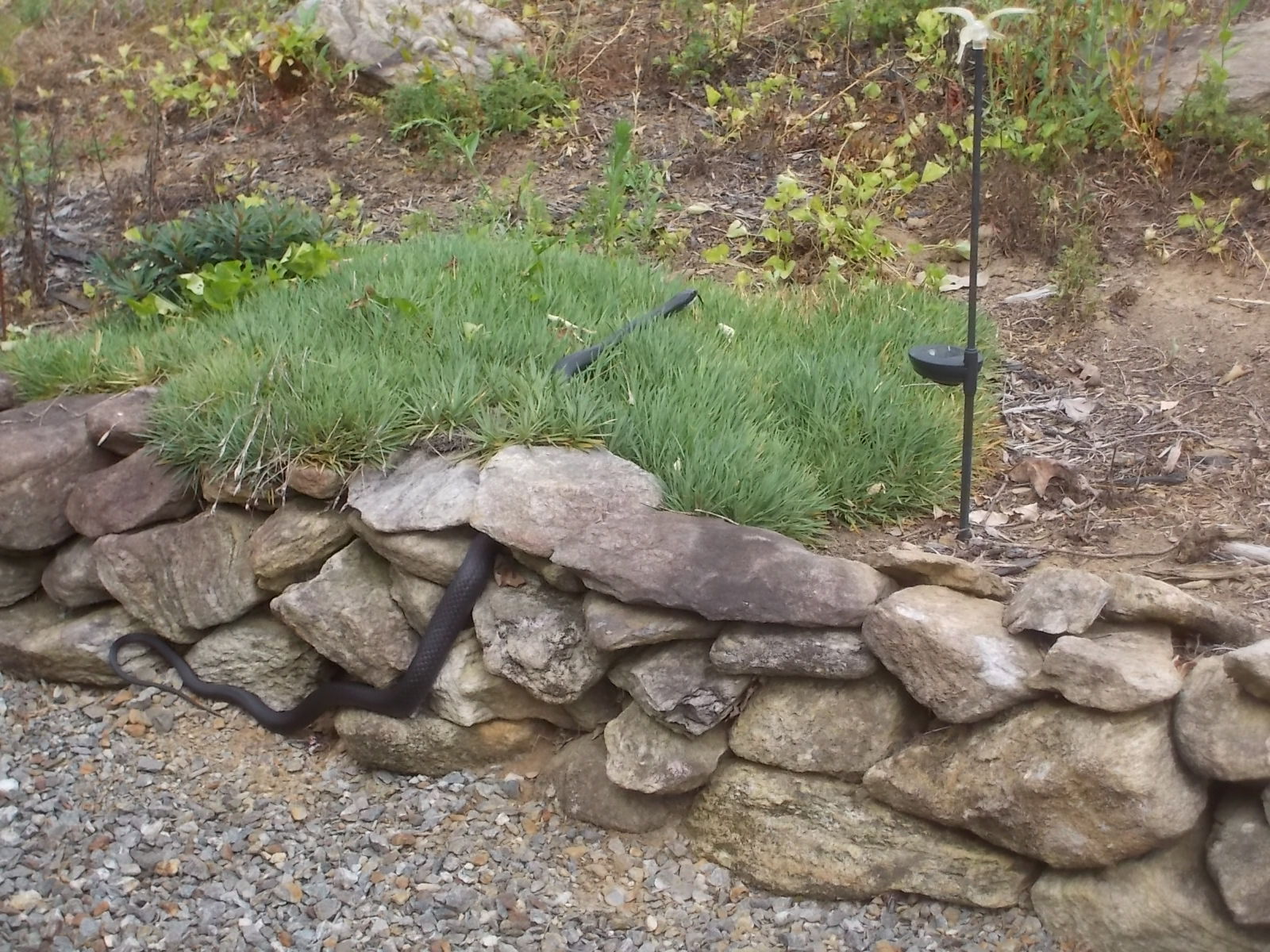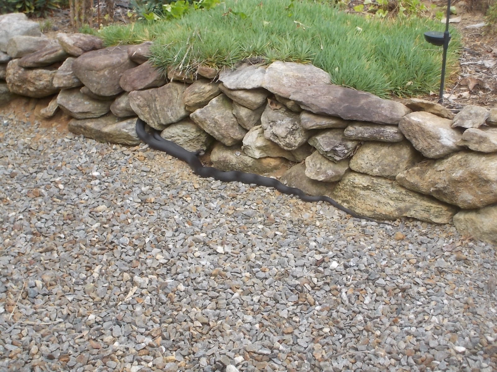 I couldn’t even see the creature, but I was already rising from the chair to get the camera. Even worse, I opened the door to go down the steps before I was sure it wasn’t poisonous. I’ve given myself a stern lecture and hope I took it to heart. Meanwhile, John was simply watching the black snake poke his head in every crevice of the little stone wall. We wonder if he was looking for our resident chipmunk, hoping that wouldn’t be Mr. Slithery’s lunch. The snake doubled back on himself and pushed into the next open space. At that point, I was watching instead of aiming the camera and saw the black head appear in the middle of the ground cover behind the wall. The old snake must have decided he was safe as he meandered off through the garden. I’m very glad our lunch was more successful than his.