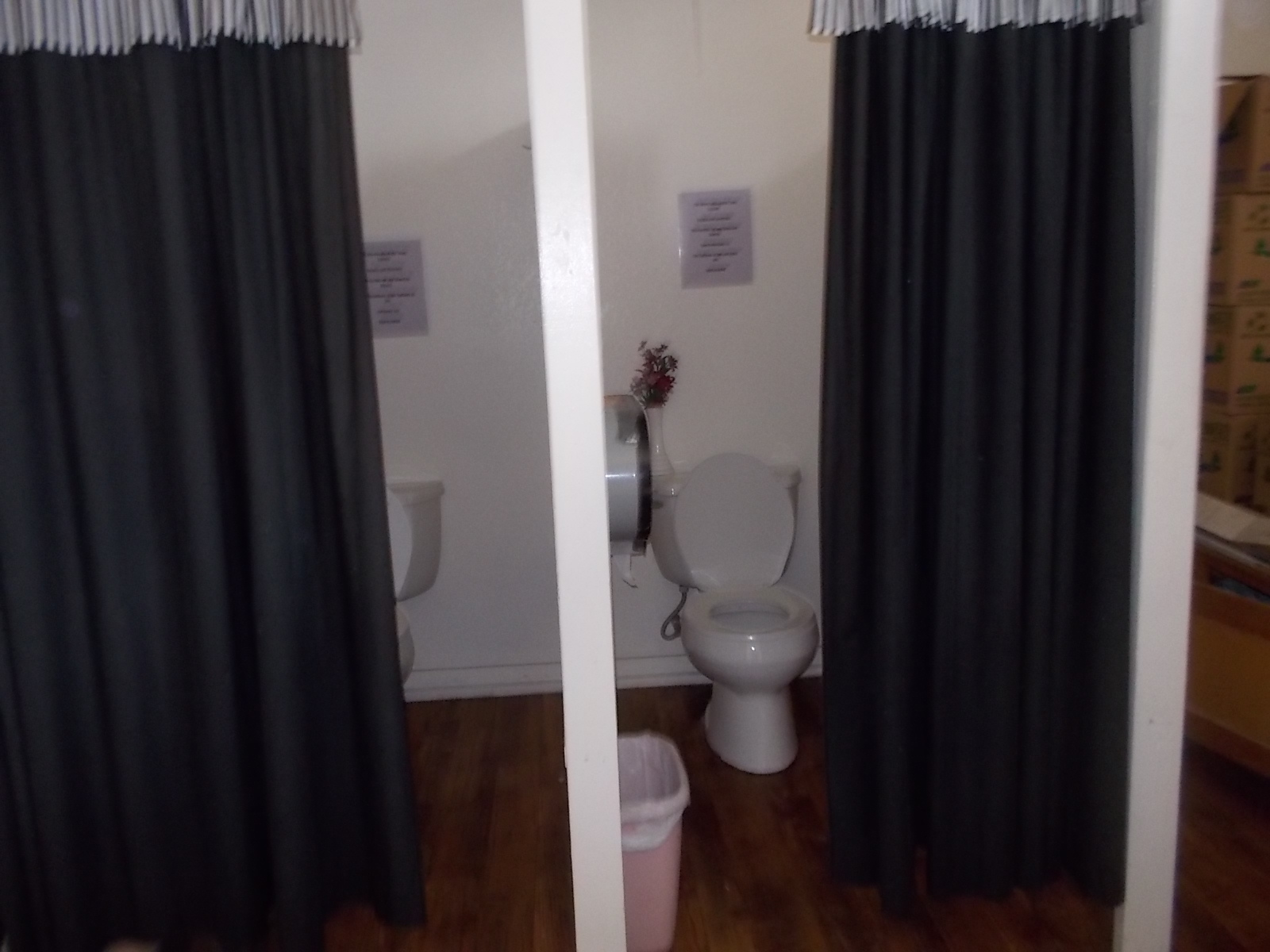 There were two amusing sights that I photographed. One was a public restroom where the two stalls in the ladies’ room had curtains instead of doors. The other was a bench made of skis.