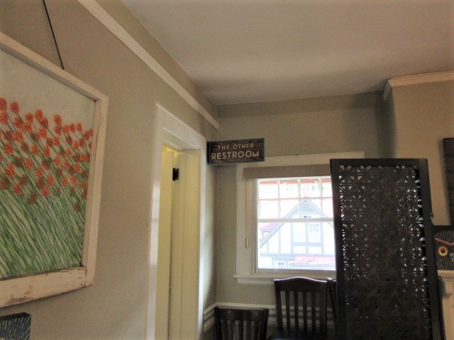 We ate lunch at the Corner Kitchen. The house was built about 1895 and has an interesting layout now. The open kitchen is in the original part of the house. We walked by it going to the addition, which houses the main dining room and bar. David and I went upstairs together to the restrooms. The first one was off the landing, and it had a sign that said a second restroom was up a few more stairs and around the corner. I laughed at the sign and had to have a photo as a souvenir. It says, “The Other Restroom.”