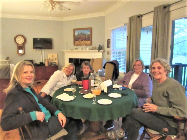While I chatted with neighbor Shawn, she said, “With your husband and Dawn’s away, we ought to get together on the porch and chat. The next morning I sent texts to the ladies of the neighborhood. All but the clown could come. (Marla was dressed as a clown for an event in Cherokee.) There was one more person to include, because Joyce told me that Frankie had come back after being away for several months. The gathering morphed into a reunion and a black-out party. Our power went out mid-afternoon, because high winds knocked down an oak tree in the mountains, severing lines to our town. I told everyone to bring their cell phones to recharge, since our generator was on. It was wonderful to be together again to catch up on news. During cold months, we don’t see each other outside very often.