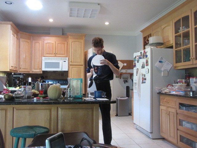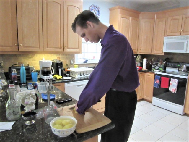Nathaniel cut potatoes for David’s brunch casserole. The dish featured potatoes, chicken, seasonings and cheese. Yummy!