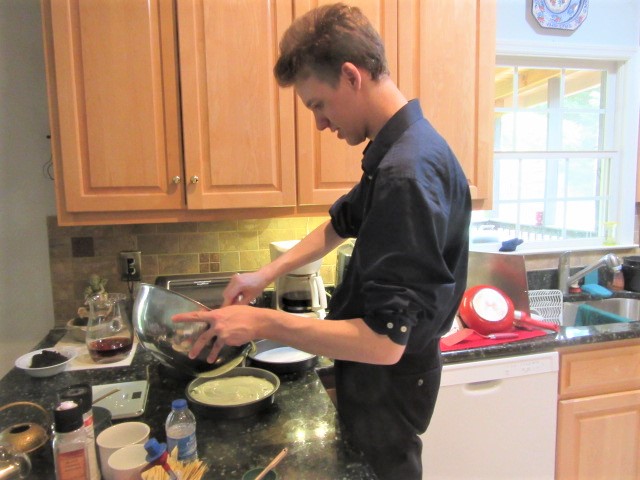 I didn’t see grandson David until we were having his birthday brunch. There was plenty of activity leading up to the meal. The day before, grandson Nathaniel meticulously cut out parchment paper to line the cake pans. He poured the batter in, and soon the kitchen smelled like a bakery. We had a whole day to anticipate that cake.