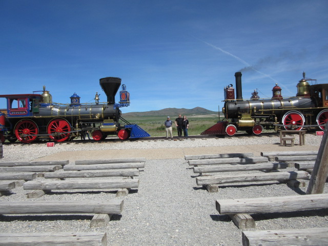 A few weeks ago there was another big ceremony at Promontory for the 150th anniversary of that event. John said 2,000 people attended. We were happy the place was practically empty when we saw it. The two reproduction steam engines moved into place, as the originals did 150 years ago. I have a photo from a distance and a closeup with John, CJ, and Lauren.