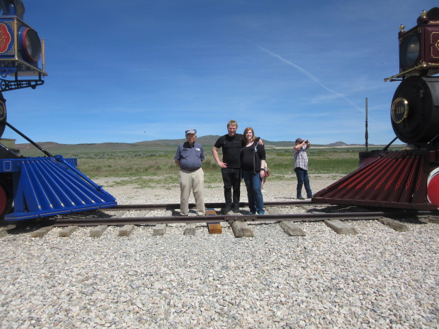 John always fanned whatever interest our family had in trains. When great nephew CJ heard we were going to Promontory, he and Lauren took the day off to drive us there. If you remember, in 1862 President Lincoln signed the legislation to build a transcontinental railroad. I remembered because John was telling me about it on a need-to-know basis. The Union Pacific started laying track in Omaha, Nebraska going west, and Central Pacific began in California going east. When they met, there was a Golden Spike ceremony celebrating the completion of a rail line going from coast to coast. Below is a photo taken that day in 1869.