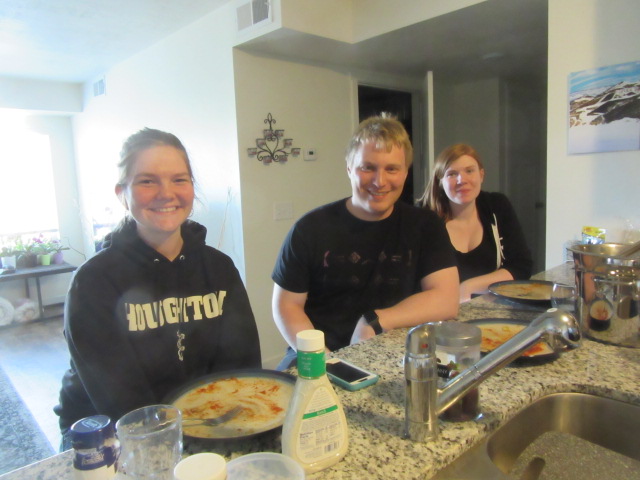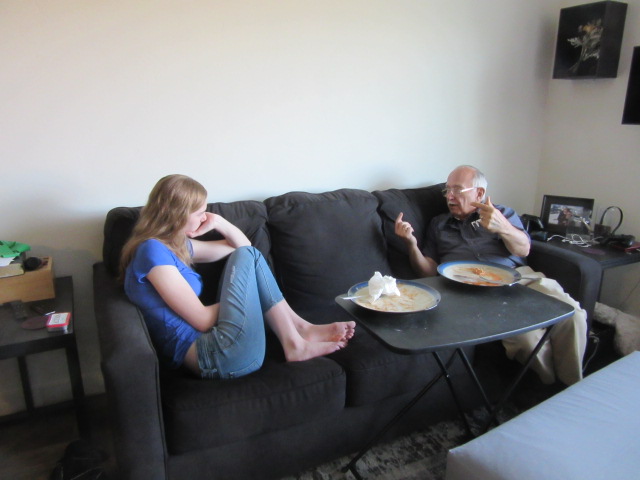 On the way back to their apartment, they picked up Lauren’s sisters, Kaitlin and Megan. Both are working at Deer Valley Resort. Kaitlin has moved to Utah, and Megan is working there this summer. A bit too late, we proposed to get take-out food, but Lauren had already started cooking dinner. It had been a long day for everyone. The meal was delicious – pasta with sauce made previously by Kaitlin and a lovely tossed salad. Kaitlin, CJ, and Lauren sat at the counter with me to eat and chat. We talked about our very first jobs, and I found it most interesting.