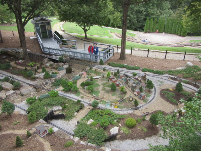 As you might imagine, we spent a bit of time near the train layout. John and David peeked in the shed to see the cars stored there. As they inspected the tracks and scenery, I watched two women with their five children in the amphitheater on the hill below. The children were cavorting on the stage and slipping through the wall of evergreen trees. It was the perfect place for them to shriek and chase each other while their mothers chatted.