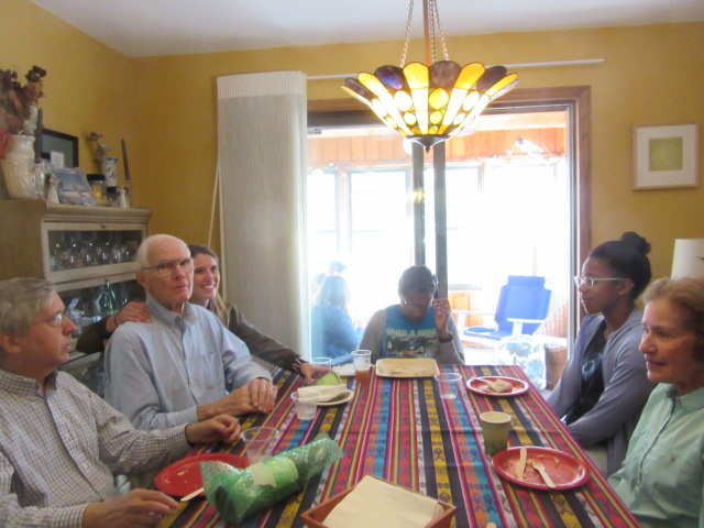 The last of the celebrations was a breakfast given by Sid’s parents. The teachers and graduate students were traveling later in the day, and the locals were going to take down the tent and decorations at the farm, so it was not a lengthy meal. We sat at the dining table with Eddie’s mother and sister, Eric, Eric’s daughter, and his father-in-law. The FIL asked about Eric’s dad, so John told the story about Haakon’s boarding the Queen Mary during World War II. It’s an amusing story, which everyone enjoyed.