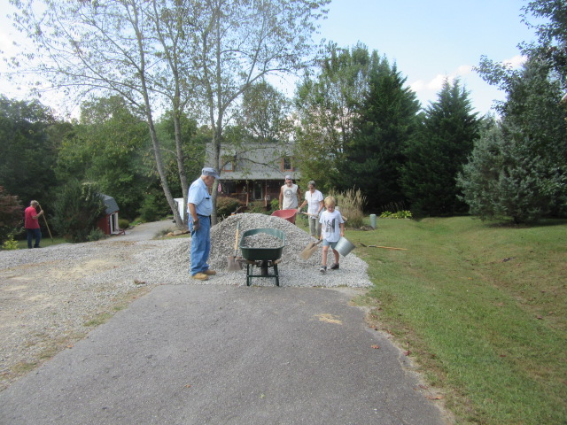 Our little street ends abruptly at the beginning of Dawn’s and Jeff’s driveway. There isn’t much room to maneuver for them or for Shawn and Bob. The men discussed widening the area, and today the gravel was delivered. Neighbor Logan (9) was visiting us when John saw people shoveling. He said he was going out to help, and Logan could go home or help. You’ll see Logan’ choice below.