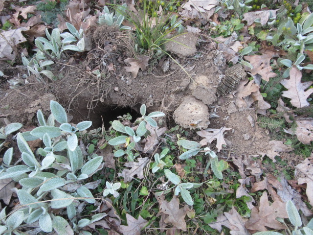 The entrance to the yellow jacket nest was tiny, only noticeable when the little beasts were flying in and out. We now think it must have been a raccoon that dug out the nest and ate the yellow jackets. He was welcome to every one.