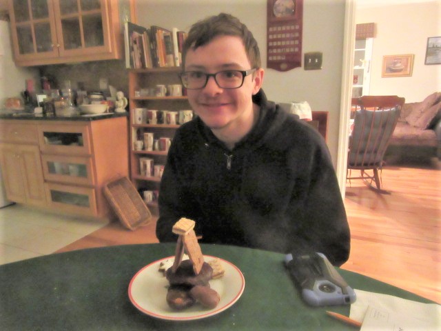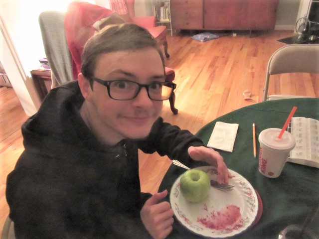 Grandson David is always ready for fun, even after being on his feet all day. It puts a bit of balance in his life. I used the apple whomper to cut and core his apple, and he reassembled it on the plate. He could have said, “Look! Gran! No hands!”