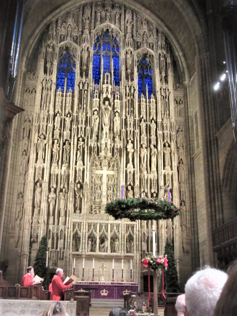 It’s the norm for the choir to have a quick rehearsal just before the service, and we’re often early enough to hear it. John immediately noticed that only the men were practicing. He had a feeling the boys were not going to sing, even though they were on the schedule to be there. Sure enough, the rector announced that because of the danger of ice falling, the boys were not allowed to leave their residence a few blocks away. He said there was heightened awareness of danger because a woman had been killed by falling debris only a few days before. Ice from sleet the night before was the present danger. As the service progressed, we became aware of how that affected what we heard. The twelve men would normally have sung the bass, tenor, and counter tenor (alto) lines. Boys always sing the top line. Five of the men shifted to share the soprano and alto lines, parts they had not rehearsed before. The director stood with them and was singing, something he normally would not do. The choir sounded as if they had intended to sing the music that way all along. We were totally impressed with their mastery of this quick change.