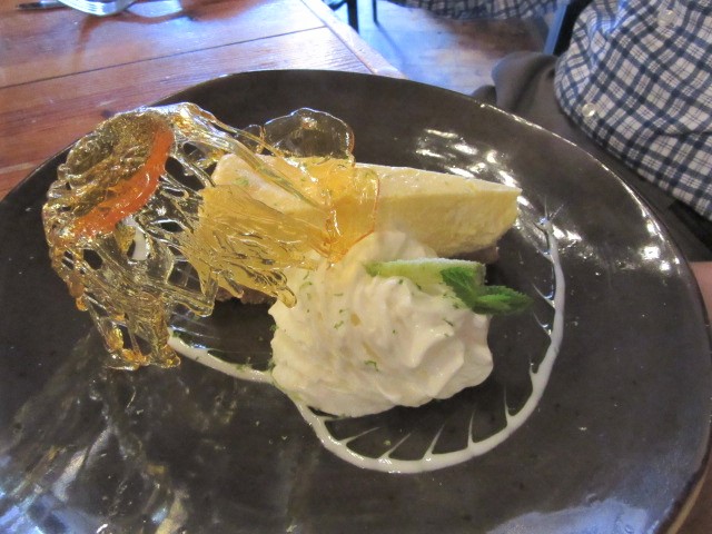 In Brevard, we ate lunch and divided this key lime cheesecake at Square Root restaurant. I asked if this was a plated dessert. Nathaniel explained that it had five elements – dessert, crunchy crust, drizzled sauce, whipped cream, and sugar sculpture. Yes, by definition it was a plated dessert. Fancy!