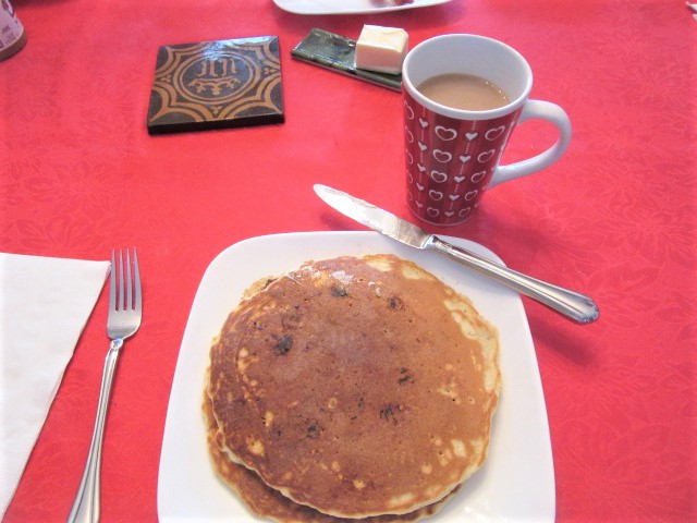 Day two began with custom-made pancakes by chef Nathaniel. He mixed the batter and personalized them for each of us. I couldn’t resist dark chocolate chips in mine, and John chose banana. Rose was imaginative. She thought of a coconut-walnut duo, which Nate easily produced. The pancakes were huge and as light as could be. My frying pan was surprised at such perfection, because it usually sees measly, flat little pucks.