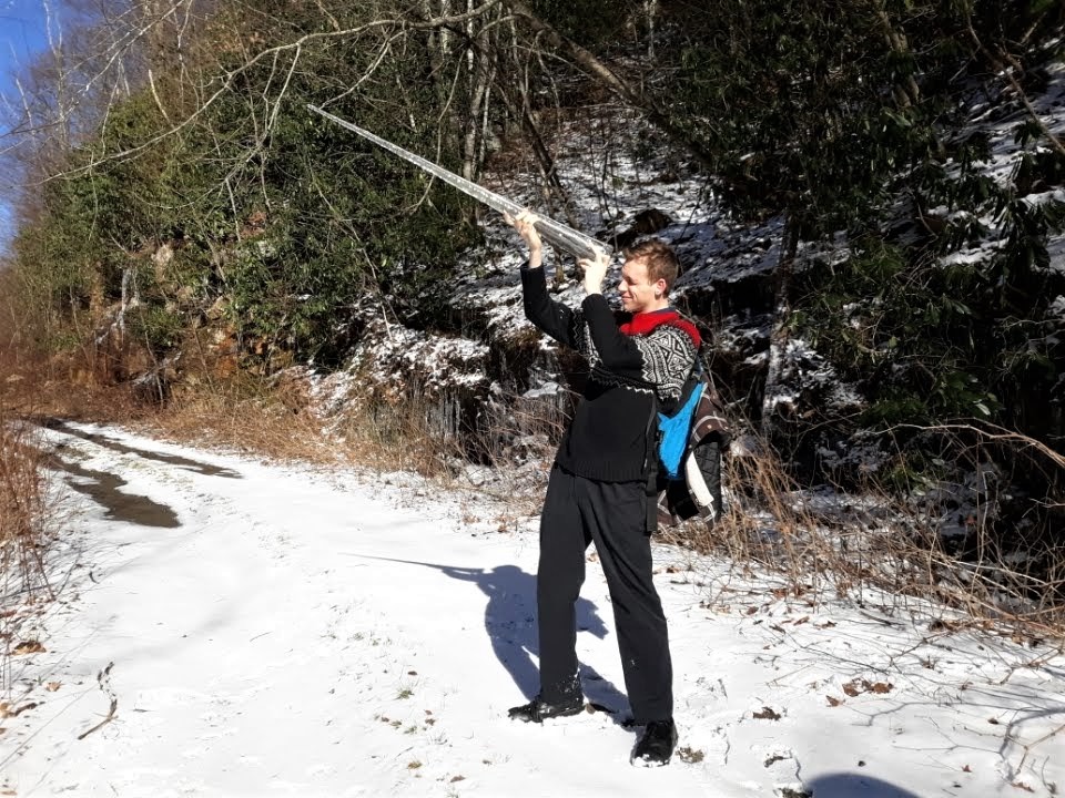 The highlight of Nate’s day was hiking with Rose and son John $pencer. They scrambled along snowy trails near the Blue Ridge Parkway. Some of the trails had not been used for a while, and they had to climb over fallen trees. Rose brought me a special photo of Nathaniel with a giant icicle. I loved the pose and was struck by how much he looks like Cousin Lars here.