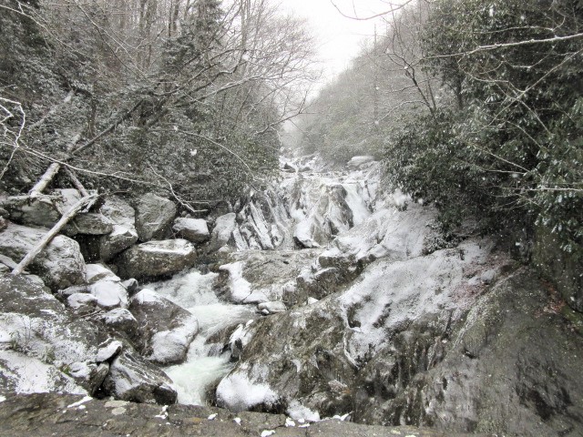 We drove by Sunburst Falls, my favorite of the close ones. It seemed to be accepting of the ice and snow.