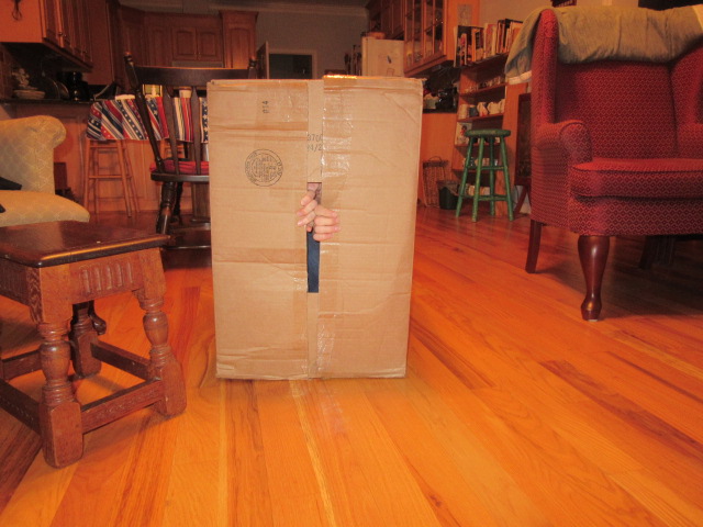 The first evening David spotted a box that had come for Lise. Knowing he was famous for squeezing into tight spaces, I wasn’t surprised that he headed for it. He was inside it in no time.