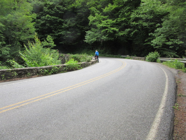 It was raining steadily as we watched the boys. I was standing in the rain, but Kate wore a raincoat and Lise sheltered under trees across the bridge. We damp people drove up to the Blue Ridge Parkway, hoping to see vistas with clouds. Instead, we were in dense fog. Bummer! We turned around and went back down the mountain, shopping at Walmart before going home.