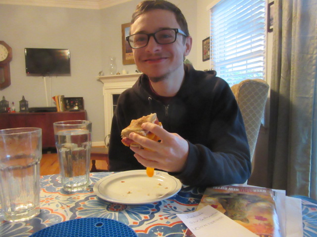 David was eating a homemade breakfast sandwich, which developed a cheese tongue as he ate. I was very aware of tongues from avoiding Sadie’s.
