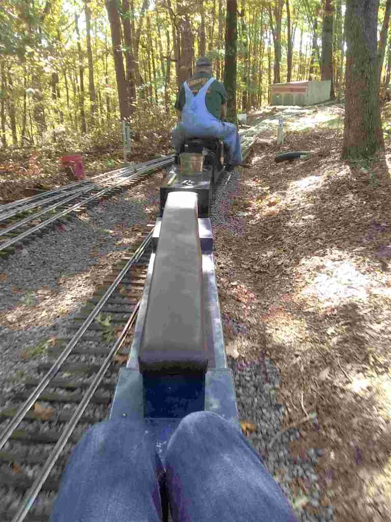 David took a photo as Bob drove the train through woods. David’s knees are in the foreground.