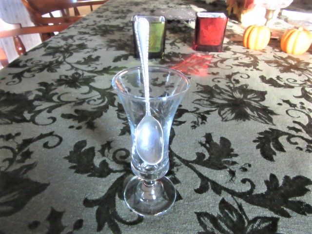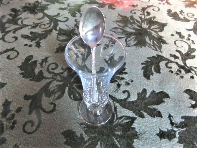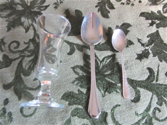 The next day I laid out the glass beside a normal teaspoon and the demitasse spoon we used to eat the pudding.