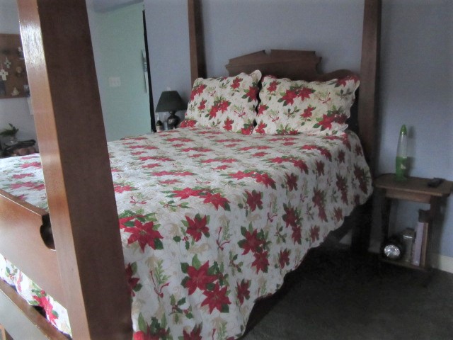 I know they are special and judging from the way he and Lily bounced over to your house, (as caught on your outside surveillance camera), those youngsters feel the same way about your family. The bedspread is pretty – I’ve never seen one for Christmas before. My great-grandmother used to quilt and when I was growing up we had some quilts on beds that she had made for my mother. We also had a tick comforter in gold satin … I remember it was on my bed and it got ripped somehow – feathers everywhere, but not my fault.