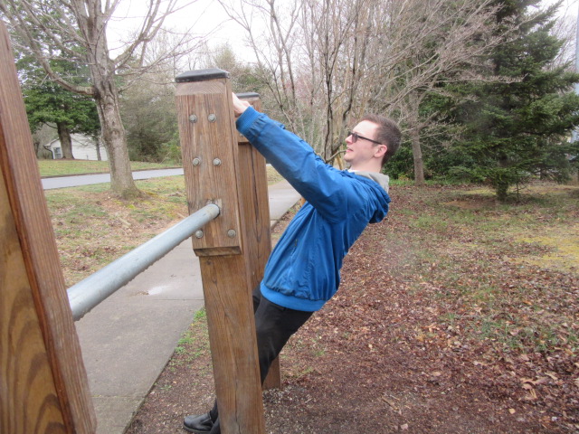 David had Sunday off, giving him a chance to enjoy his brother. We walked along a paved trail with exercise equipment along the way. Some of the stations had instructions showing what could be done. David went for the high bar.