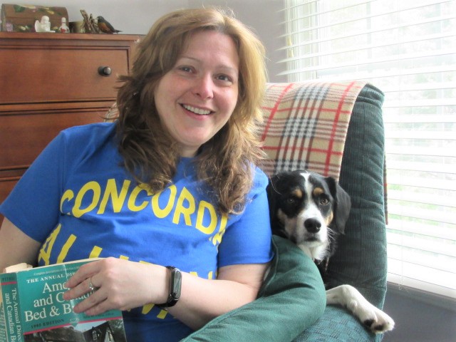 Daughter Lise worked the first half of her COVID visit, and now she is on vacation. She always loves relaxing with Sadie. The dog considers the green recliner her own, so when Lise sat in it, Sadie jumped up and pushed her way to the back.