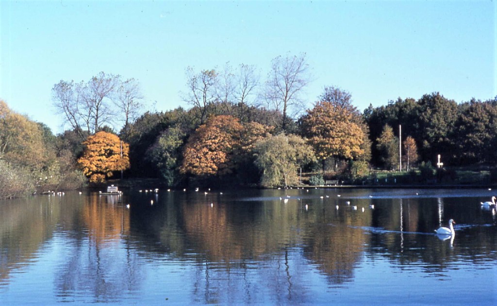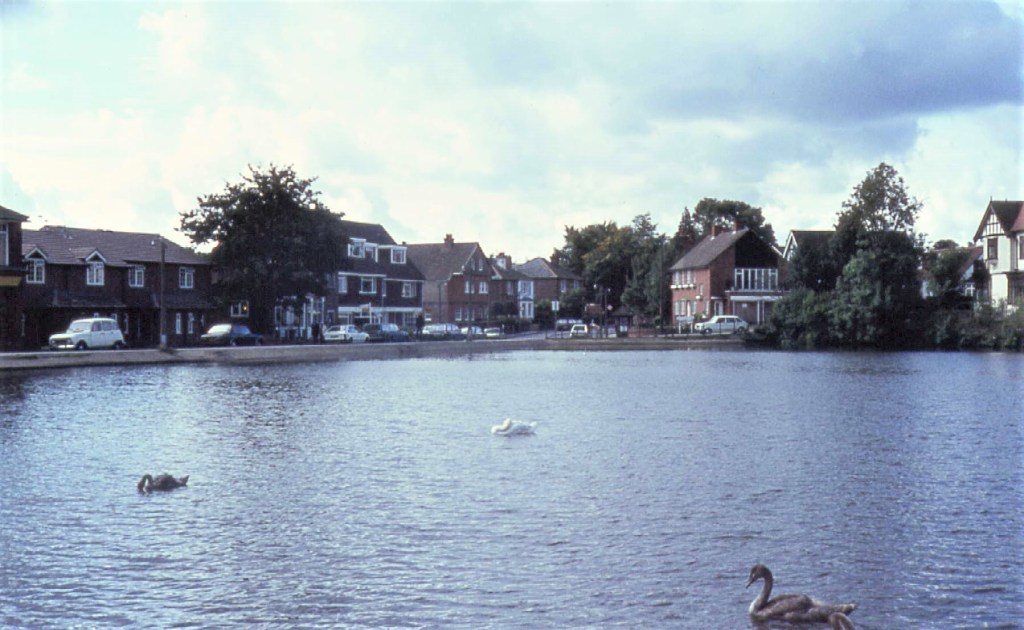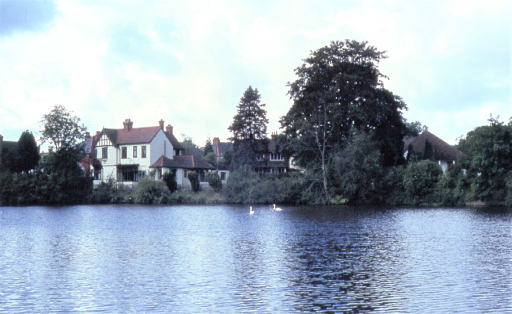 Once, and only once, the pond froze over while we were living there. Lisa and Kate were used to the idea of walking on frozen ponds from being on Long Island. We dressed in our warmest clothing, and the girls stepped onto the ice from the sidewalk in the distance here. Nothing could have been further from our minds the day this photo was taken.