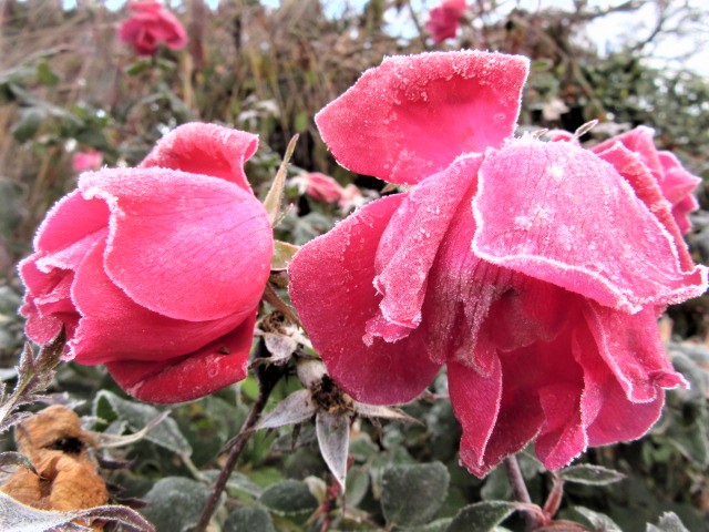 The petals have fallen off the frozen roses now. If the weather warms up a little, I’ll have to trim the rose bush.