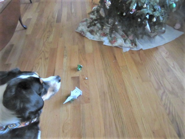 As I walked toward the living room, I could see ornaments on the floor. Either Sadie’s tail knocked them down, or they fell off the wilting branches. I’m thankful I see well enough to avoid objects at unexpected places before stepping on them.