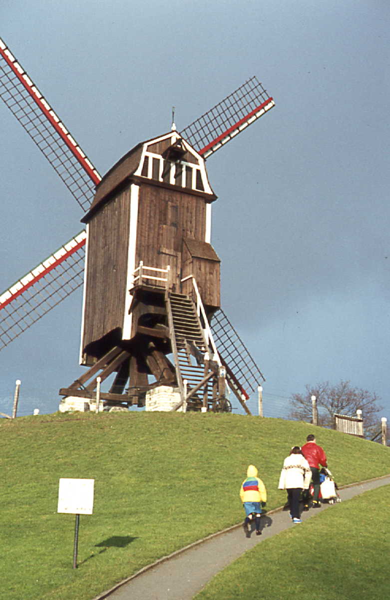 At different times during the day we bought little apple pastries in the open market, chocolate confections from a pastry shop, and went in an ice cream parlor to get warm. There had been snowflakes dancing around in short showers under blue skies until afternoon when a fierce black cloud covered the sun. The wind kicked up as we looked at two preserved windmills, and suddenly we felt we were in a blizzard. We took refuge in the ice cream place, ordering hot chocolate and pancakes. The chocolate came in tall glasses with a lump of sugar and a cookie on the side. Pancakes were two crepes each with a tray of sugar, chocolate sugar, raspberry jam, butter, and whipped cream. [Too bad Lise didn’t have her iPhone back then. She would have taken pictures of the lovely food.]