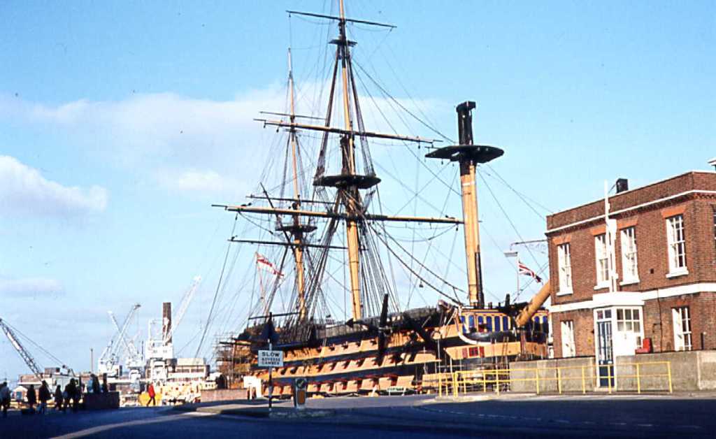 We didn’t even have a map in the car with us since we left home in a hurry, and the weather didn’t look as if we’d enjoy racking around the countryside. The sun kept threatening to shine, finally did, and we had fun poking around Portsmouth. We had an excellent tour of Lord Nelson’s great battleship, HMS Victory. He was the admiral of the fleet, directed and won the battle of Trafalgar, and was mortally wounded in the fight. There are brass plates on the deck showing where he fell, and markers where he died several hours later on the surgeon’s deck.