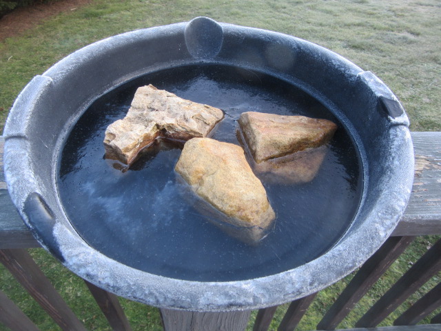 Before going out to walk, I looked at two thermometers. The one on the deck showed it was just above freezing, while the one on the back porch proclaimed it was just below freezing. Maybe I should check what the birds were dealing with. From the top, the birdbath didn’t look bad.