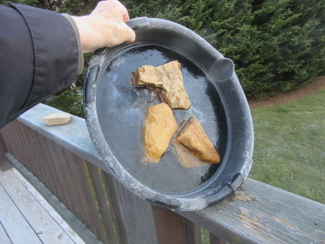 On a hunch that the underside would be interesting, I turned the mold over. There seem to be strands of ice from the rocks to the surface, working to tie them in firmly. When I showed grandson David the photos, it occurred to me that the rocks were poking above the water. I have little scientific knowledge, but I wonder if the rocks were colder than the water. That could explain why there was extra ice attached to them.