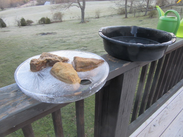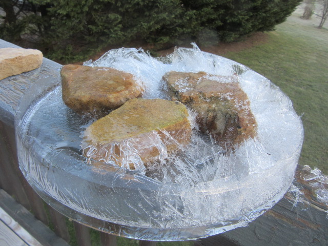 Taking the ice out of its mold, I set it on the railing. Can you see the round hole in the top where I poured in very hot tap water?