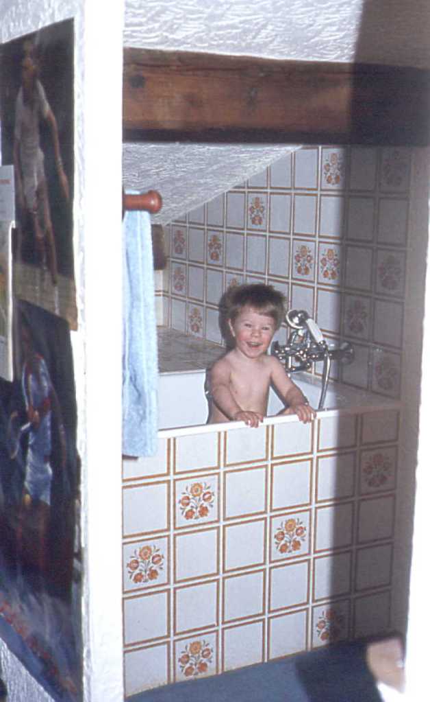 That was a cute pic of $ in the bathtub with a big smile. I remember those baths with the flowered wall tiles from my travels as well. I think that was the first time that Kate was in a pic and she was not smiling from ear to ear!