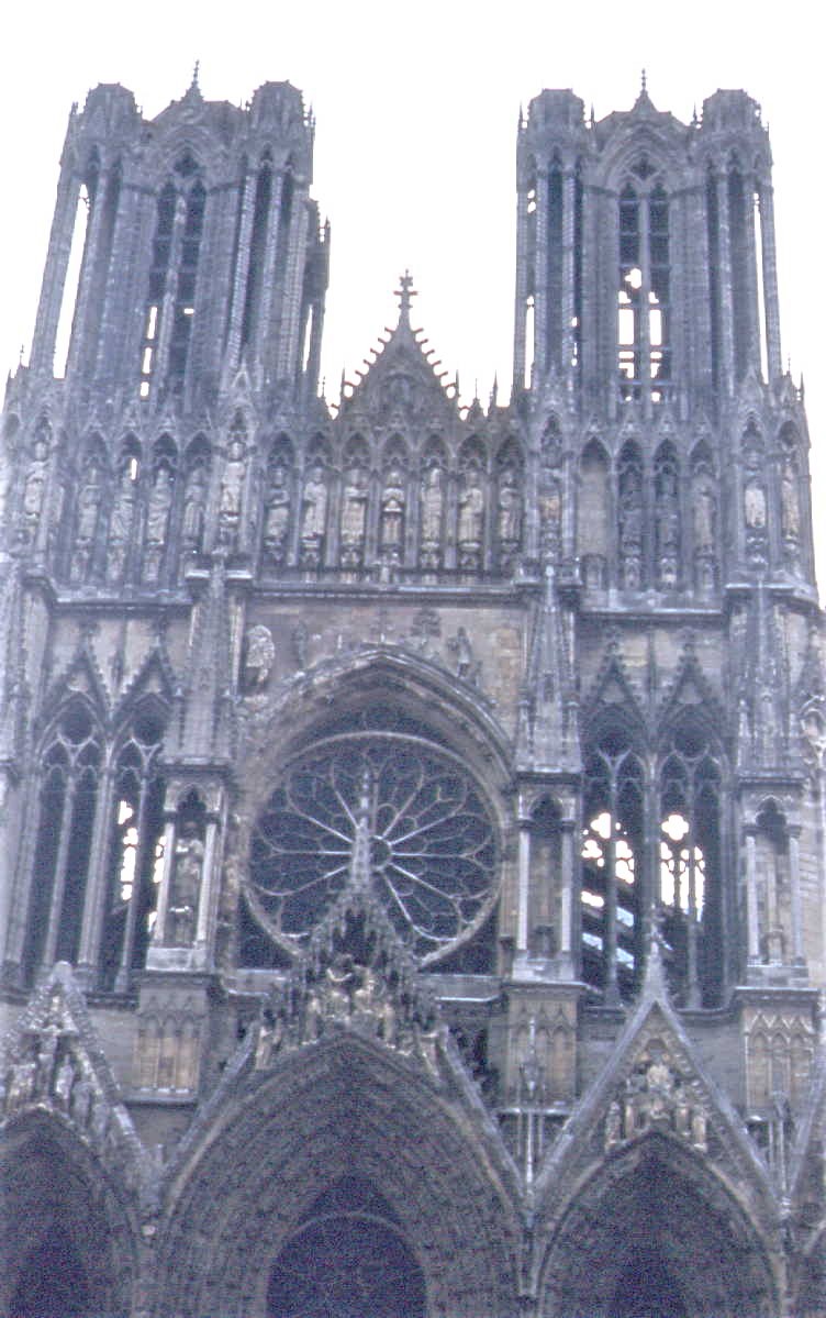 Riems or Rhiems is pronounced something like “Reh”. It boasts the cathedral where Joan of Arc stood beside the King at his coronation. Her statue and a ratty old banner are near the altars. Another Marc Chagal window is in the East widow, visible from the rear over the altar. (The last window we saw of his was in Chichester Cathedral.)