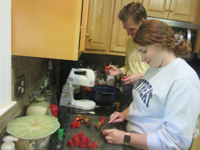 A Nathaniel creation was planned from the beginning, and he made a strawberry shortcake with the berries he, Sarah, and friend Dakota picked the day before. Sarah did a beautiful job of preparing the berries.