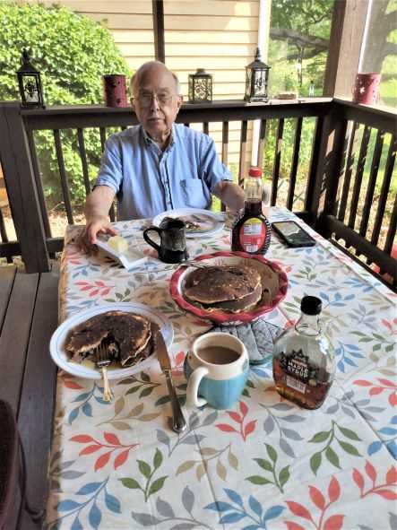 One of the first days we ate breakfast on the porch this season, we had blueberry pancakes. John thought I was just taking a shot of the food, so he sat there quietly, not smiling. I might have done a retake if the pancakes had not been getting cold.