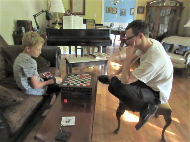 Logan came one afternoon, playing checkers with first John and then grandson David. Three of us also played Set, using real cards instead of doing it online.