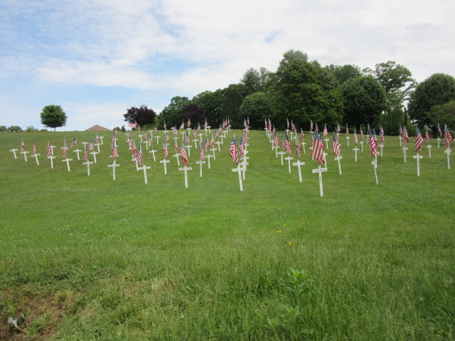 John always notices and comments on the flags the town of Waynesville puts out for Memorial Day. Each flag has a name of a resident who died in war. We’ve seen this done in other towns, too.