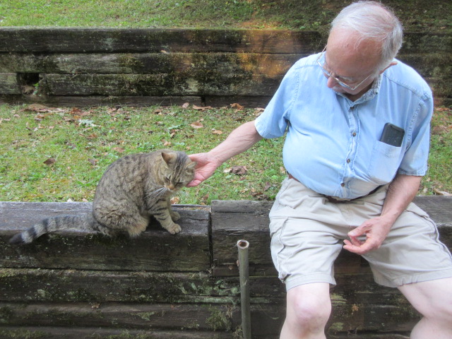 John and I stay busy, but many of the things we do are not worthy of a blog post. Often neighbor CAT walks with us, and lately she joins John on the retaining wall for a leisurely scratch.
