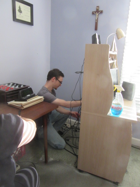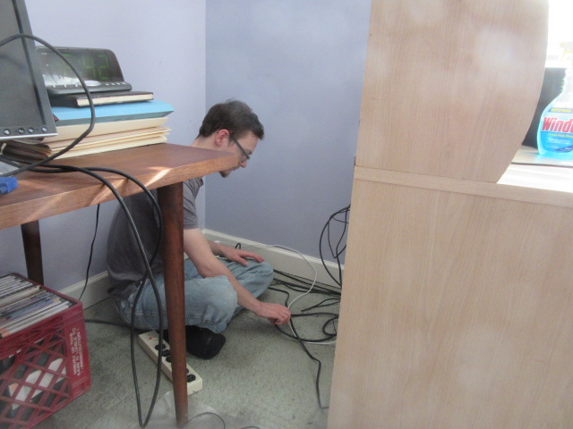 David untangled wires behind John’s computer desk. The desk had been moved quickly, and we wanted to replace a monitor with one Lise found in a closet.