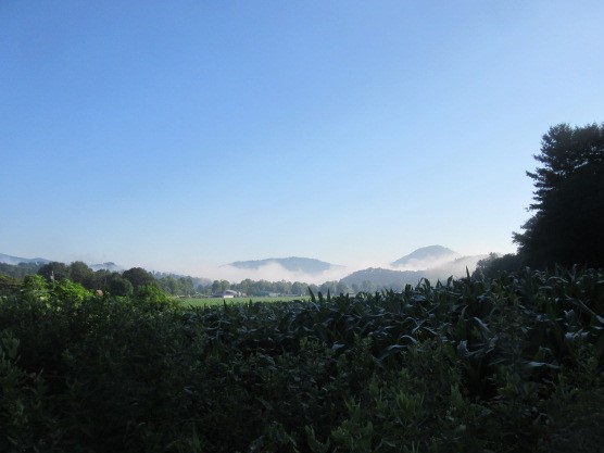 As we started up the steep hill this morning, we stopped to admire the mist and the mountains. Lise was sure the corn in the foreground grew overnight. There is always something to see that is different from the day before.