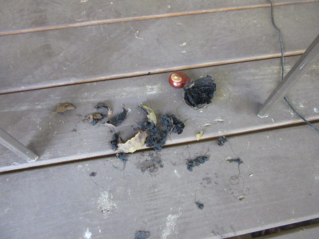 On my porch was a scene of destruction under a chair. The day before, the chestnut lay peacefully beside a black walnut, still in its light green covering. Daughter Kate put them under her chair the day we sat outside after walking to the creek. I suspect a squirrel stripped the covering off and stole the walnut. He was welcome to it, and I shall clean up the mess as a good hostess would.